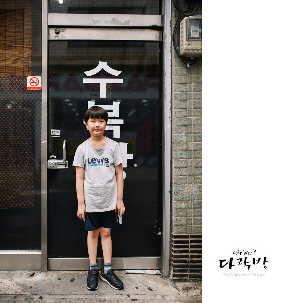 아빠가 너무 좋아하는 수복빵집 앞에서 기념 사진을 찍은 진진이.