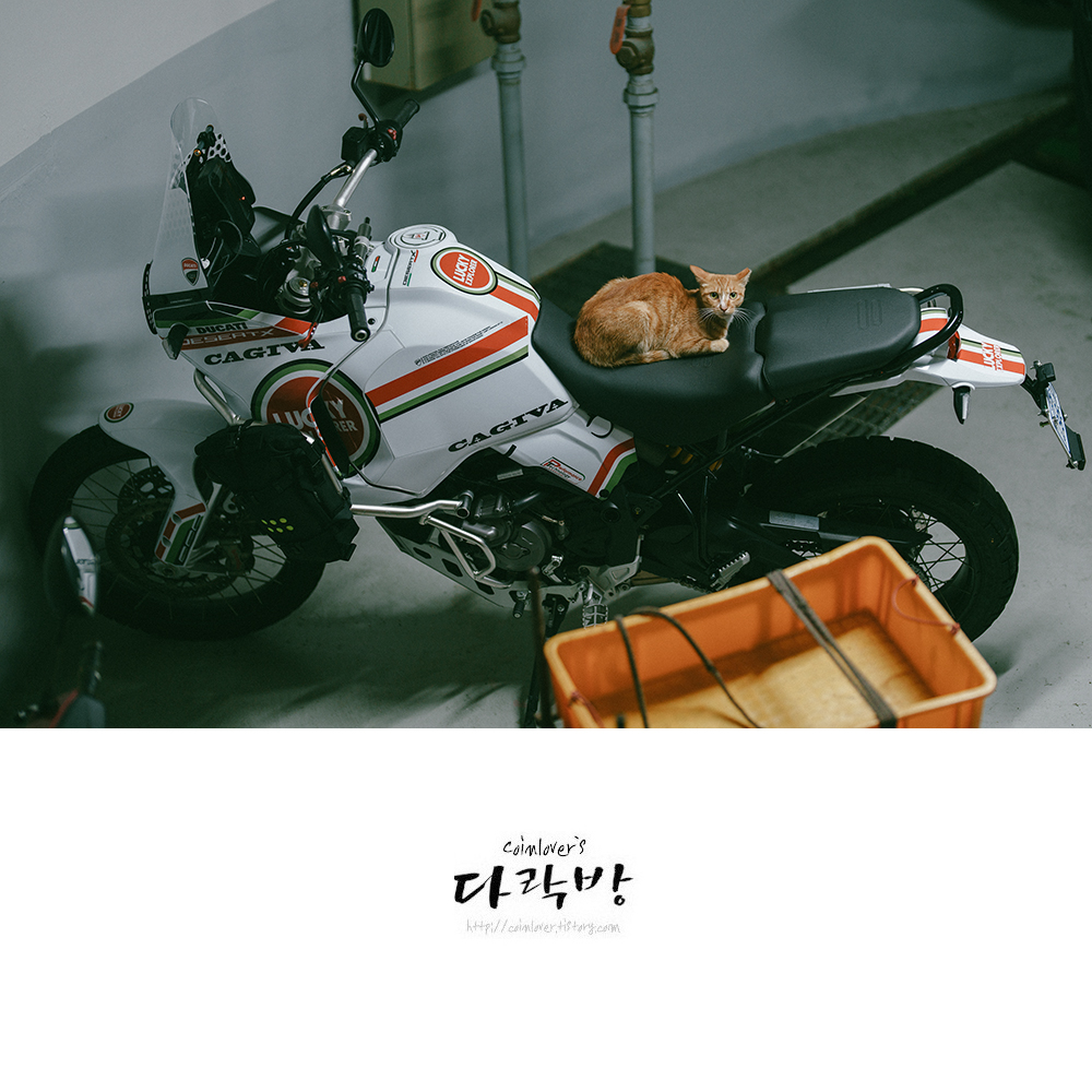 출근하려고 지하주차장에 갔더니 아람이가 폭우를 피해 오토바이 안장에 앉아 있었다.