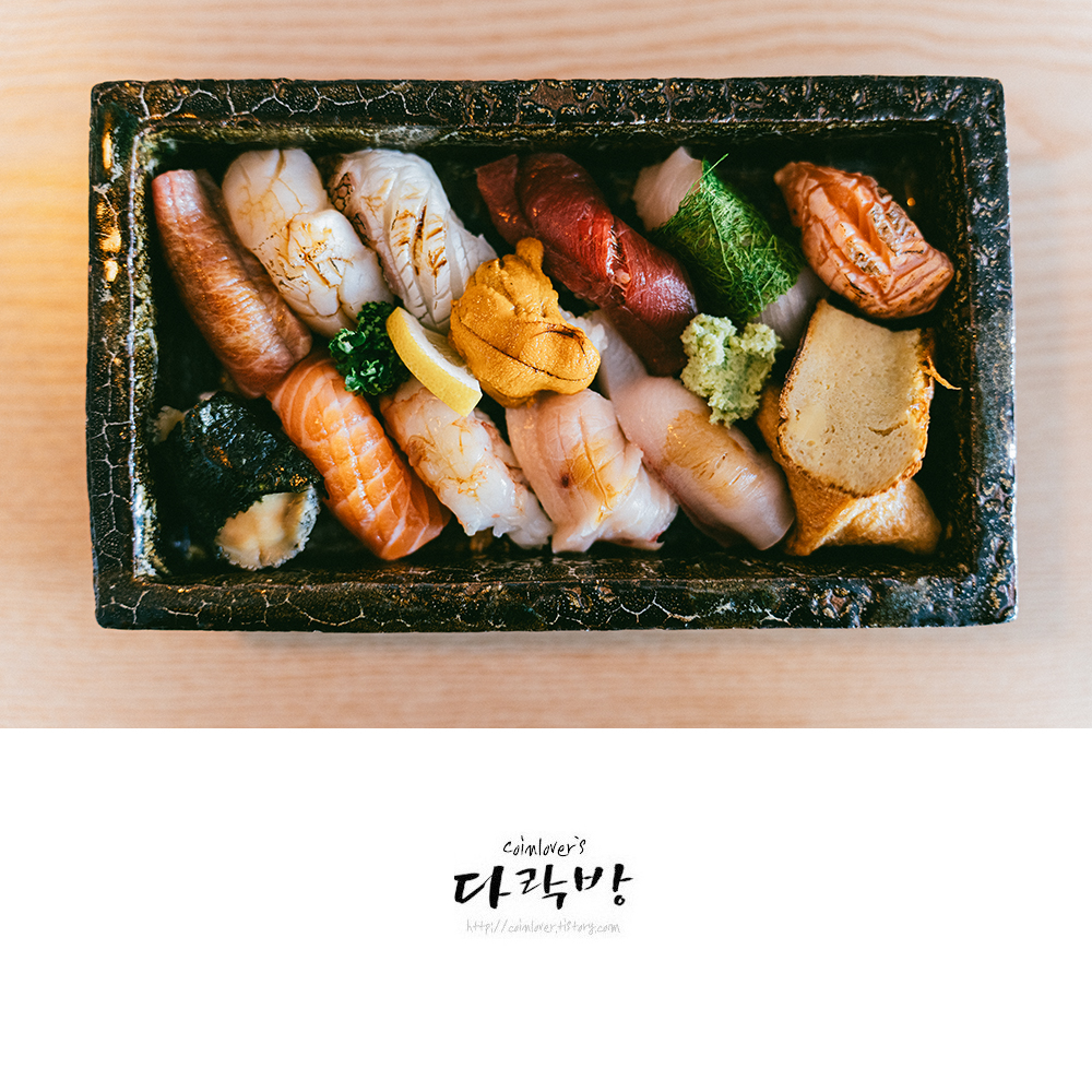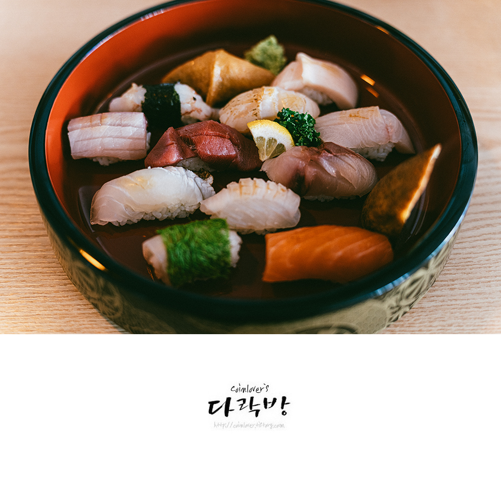후식으로 나온 귤. 이게 제일 아쉬웠다. 이렇게 자르니 보기는 좋아도 까먹기가 힘들어서. 그리고 초밥 구성에 힘을 쏟느라 단가 맞추려면 대단한 디저트를 낼 수 없다는 걸 알지만 그래도 아이스크림이나 양갱처럼 달달한 것 혹은 산미가 느껴지는 셔벗 같이 입가심을 하면서도 심리적 만족감을 높여주는 게 나왔으면 좋았을 것 같다.