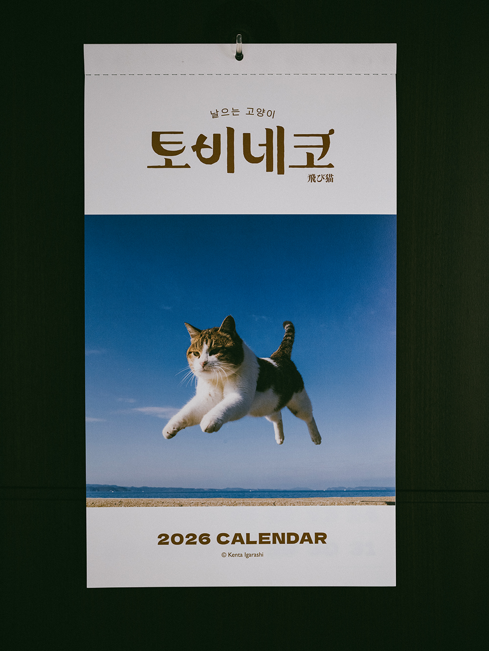 2026년 달력은 토비네코(날으는 고양이). 달력을 걸고 나니 2026년이라는 게 실감 난다.