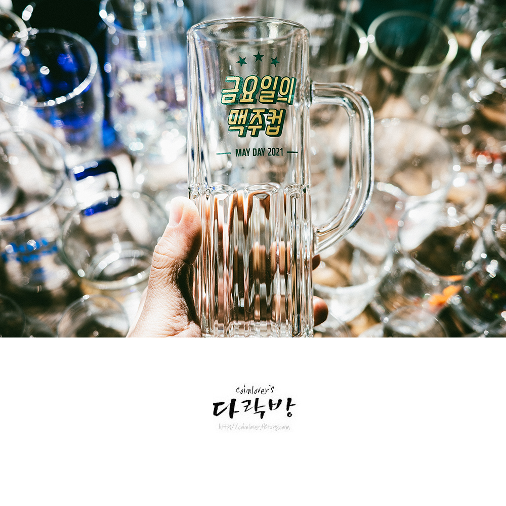 코로나가 한창일 때 받았던 노동절 기념 맥주컵. 한창 다이어트 할 때라 금요일 치팅데이만 기다리고 살았는데 그때마다 맥주잔으로 잘 사용했다. 지금도 불금의 동반자로 잘 쓰고 있다.