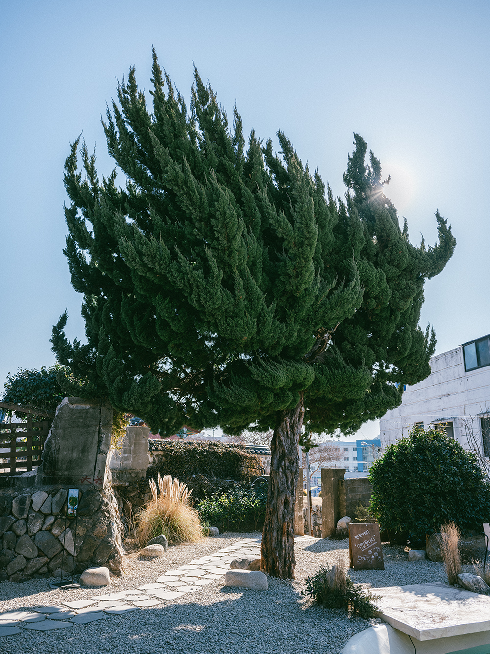 통영 짹짹커피가 세병관 옆 간창골로 확장 이전을 했다길래 다녀왔다. 이전에 거제 본점, 진주점, 통영점 세 군데를 둘러봤었는데 사실 농협 창고를 개조해 만든 본점 빼고는 큰 감흥이 없었다. 중앙시장 안에 있었던 통영점은 좁은 공간에 젊은 감각을 때려 박아놨던 나름 힙한 곳이었지만 조용히 앉아서 시간을 보내고 싶었던 내겐 버거웠기에 한두 번 들린 게 다였다. 그래도 에스프레소 등의 음료와 디저트는 나름 맛있게 먹었던 지라 넓은 곳으로 이전한다고 하니 내심 반갑기도 했다. 세병관 주차장 왼쪽 바로 옆길, 세병관으로 가는 오르막으로 조금만 걸어가면 안내 입간판이 보인다. 위치가 진짜 좋다. 특히나 관광객들에게는. 간창골에는 고양이 사진 찍으러 자주 다녔는데 이곳에 이렇게 넓은 공간이 만들어질 거라고는 생각 못했다. 역시나 사업하는 사람들의 눈은 나 같은 무지렁이 하고는 다른 것이다. 입구부터 맞이해 주는 통영에서 본 최고로 멋진 향나무(중의 하나)가 시작부터 압도적인 위용을 자랑한다. 이 집에서 제일 맘에 드는 건 다름 아닌 이 나무였다.
