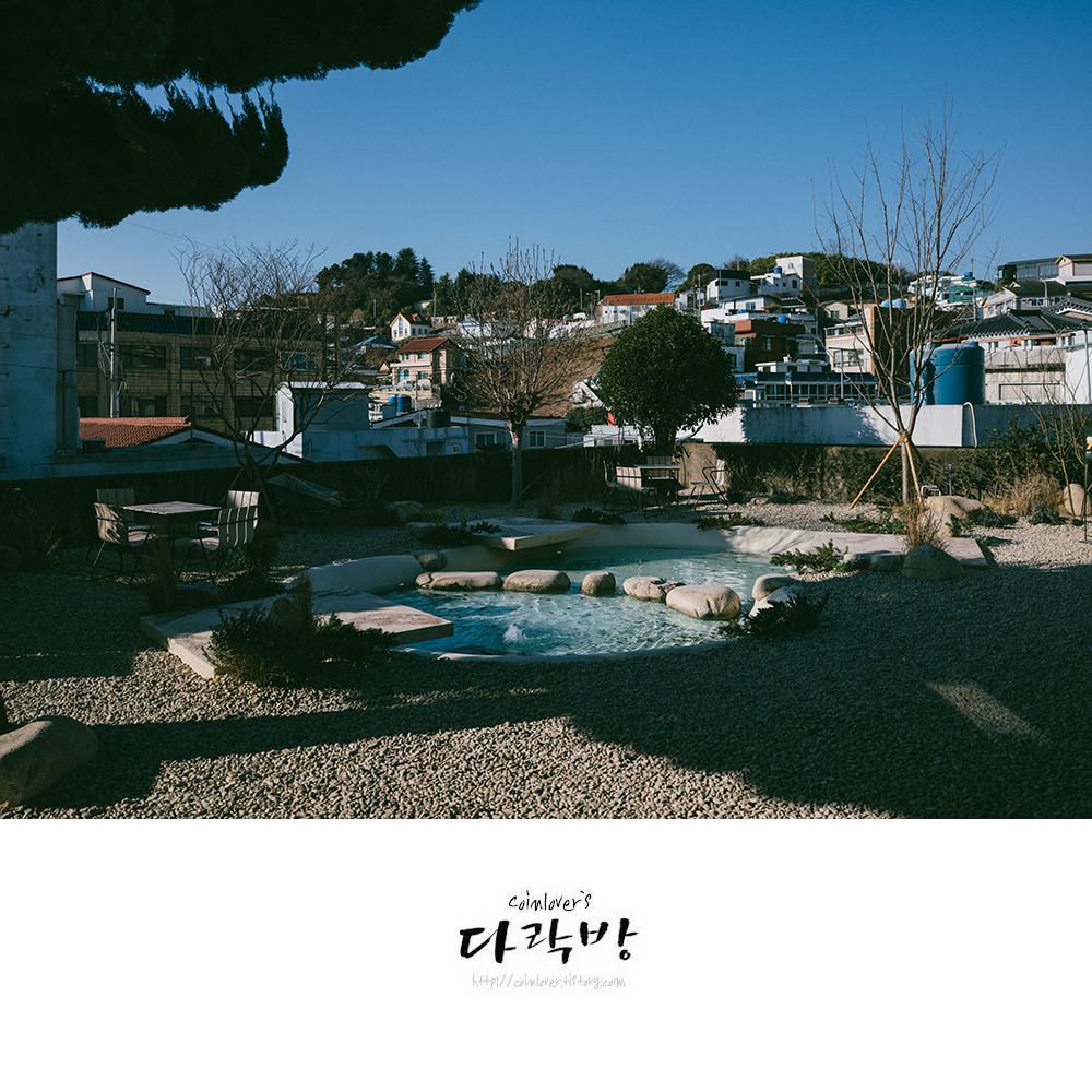 내부로 들어가면 작은 자갈돌이 깔린 앞마당과 연못이 반겨준다. 곳곳에 테이블과 의자가 놓여 있어서 봄가을에 계절을 즐기기 좋을 듯했다. 인공연못에 드리우는 빛과 물그림자가 청량함을 더해줘서 무거워 보일 수 있는 한옥 카페가 조금 더 경쾌해보였다. 마당 쪽은 아직 정리가 덜된 느낌이기도.