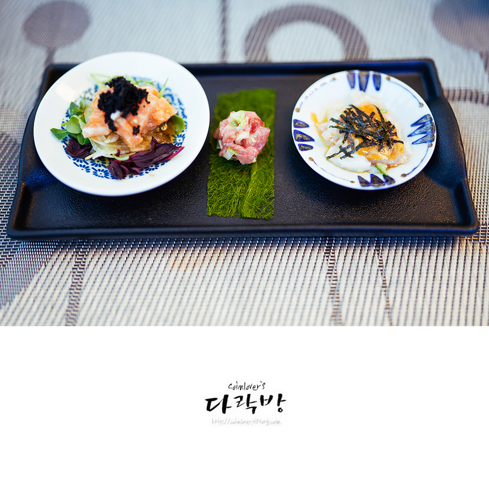 연어샐러드, 감태 오도로마끼, 광어 고노와다.