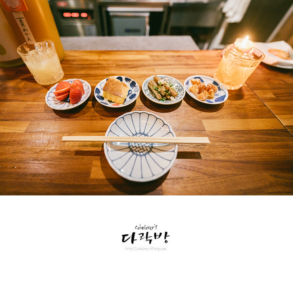 일식 주점이니 기본 안주를 오토시라고 불러야겠지. 딸기, 교꾸, 우엉조림, 건과일이 나왔다. 교꾸와 우엉조림이 참 좋았다. 저것만 갖고도 사케 잔술 한두 잔은 넘길 듯했다.