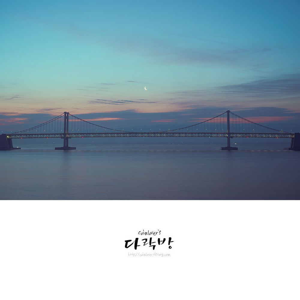 새벽에 일어나니 광안대교 한 가운데 달이 떠있었다.