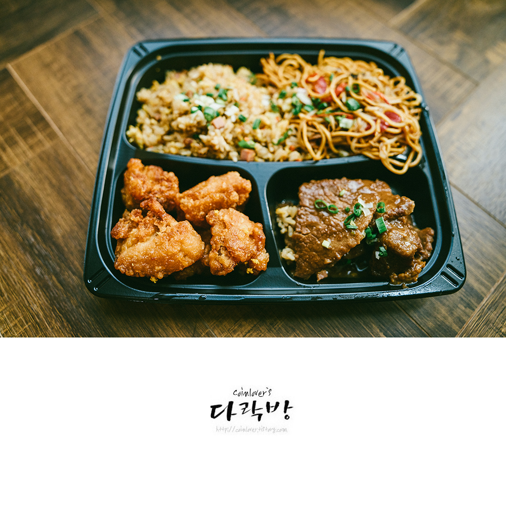 미국식 중국요리 아이엠바오에서 포장해온 라지플레이트. 어릴때 미국 영화나 드라마를 보면 등장인물들이 네모난 종이 용기든 볶음밥이나 면요리를 어설픈 젓가락질로 먹는 장면이 나오곤 했는데 그게 그렇게 맛있어보였다. 미국화된 중국요리는 어떤 맛일까 궁금해서 사봤는데 대단한 맛은 아니었지만 한끼 가볍게 먹기엔 나쁘지 않은 수준이었다.